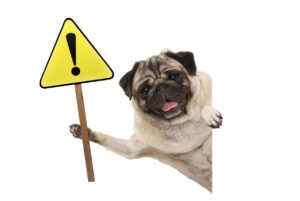 smiling pug puppy dog holding up yellow warning, attention sign with exclamation mark